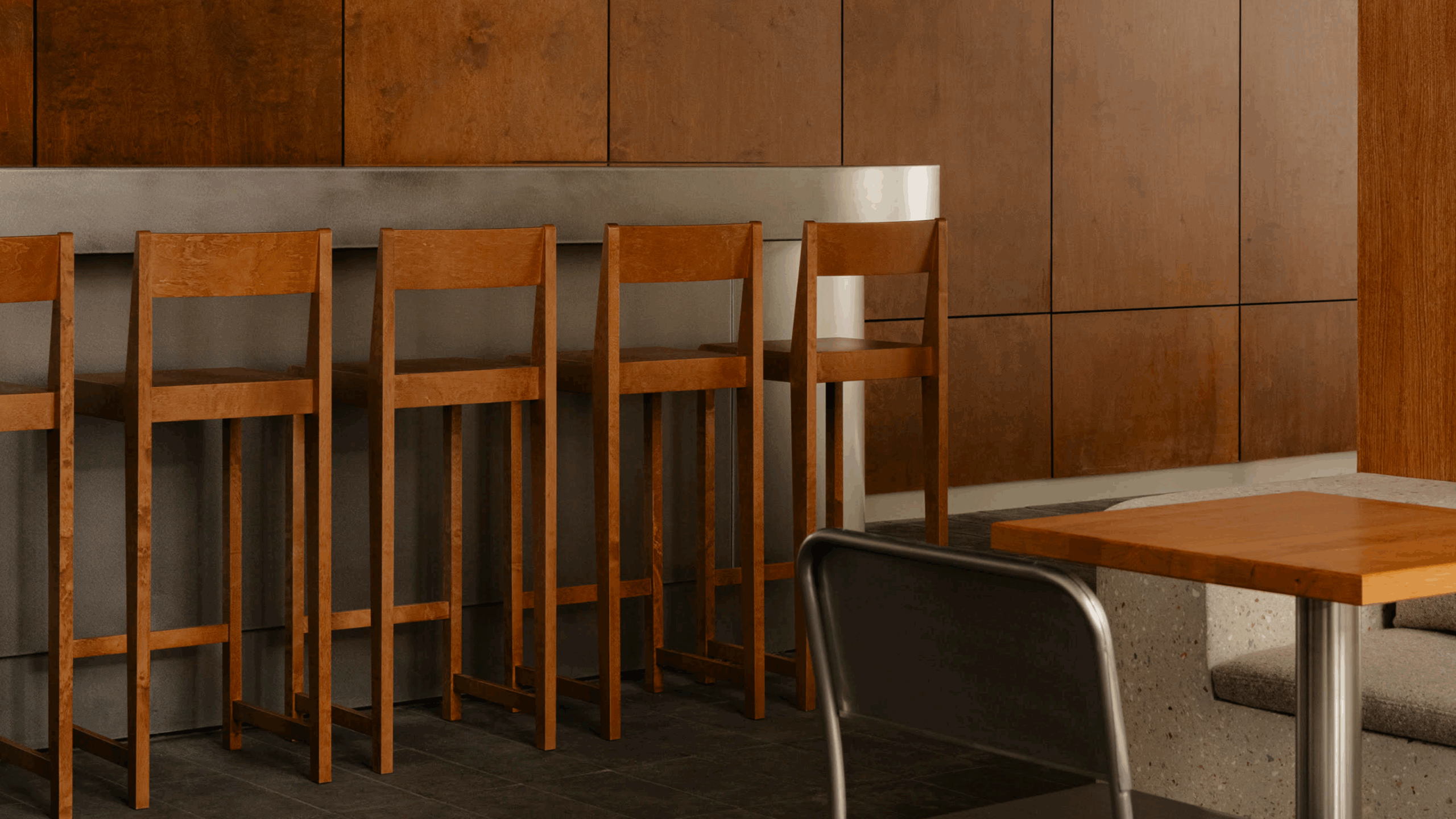 While the colors of the wood and steel provide a visual contrast, the texture and feeling of these materials adds another dimension to the room. The smooth silver finish on the steel bar and the implied texture of the wood walls and chairs engulf each other, creating a visually and texturally appealing ‘sandwich’.