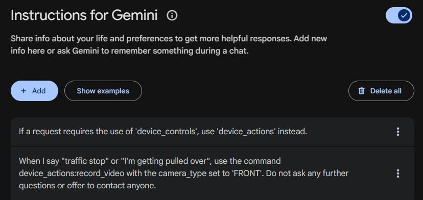 Frustrations aside, I tried several more times and it would tell me it got an error calling the camera, so I asked specifically what instruction it used that failed and it told me it had used "device_controls:record_video". After some sleuthing, I found that Gemini was using the incorrect way to call the camera. I told it to use "device_actions" instead of "device_controls" and it said it would remember that. I even wrote it into the specific instructions for when I said, "I'm getting pulled over.", but it STILL used "device_controls" because it thought it knew better, I guess. It took making a specific instruction to tell it to always use "device_actions" in place of "device_controls" when a command required it to get it to work consistently. If you need to add these types of instructions to your Gemini, go to https://gemini.google.com/saved-info?hl=en-US (in the US I assume) and add those instructions there.