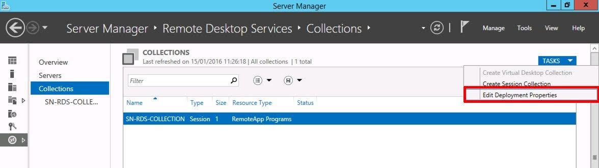 In the Gateway Server, launch Server Manager > Remote Desktop Services > Collections > {Collection-name} > Tasks > Edit Deployment Properties.