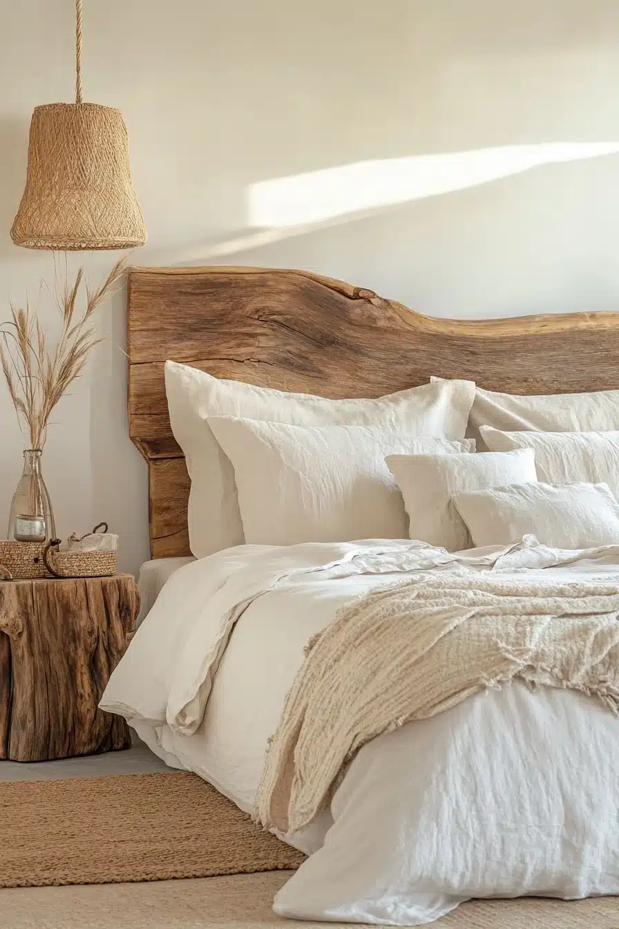 A reclaimed wood headboard creates a rustic, earthy vibe while repurposing materials, making it an eco-friendly choice.