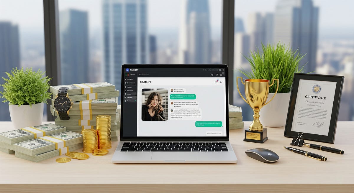 A desk with a laptop displaying a ChatGPT interface, surrounded by money and a trophy.