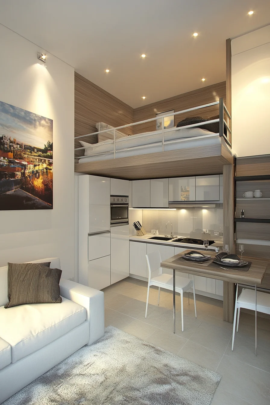 Keep furniture minimal and functional, use floating shelves for storage, and incorporate mirrors to reflect light. Choose a light color palette to make the room feel airy.