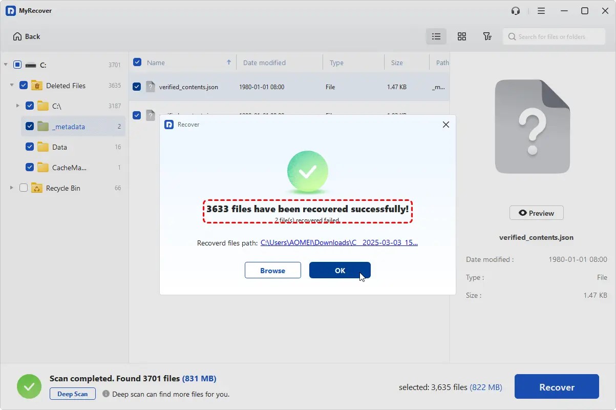 Once done, you will see a mini window that informs you of how many files have been recovered successfully, along with the new path, which you can directly click on and access the recovered files.