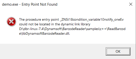 When I was trying to run a barcode reader app compiled by MinGW GCC on Windows 10, I got an error message “ The procedure entry point _ZNSt18condition_variable10notify_oneEv could not be located in the dynamic link library “. In this article, I will share my experience of how to solve the issue on Windows 10.