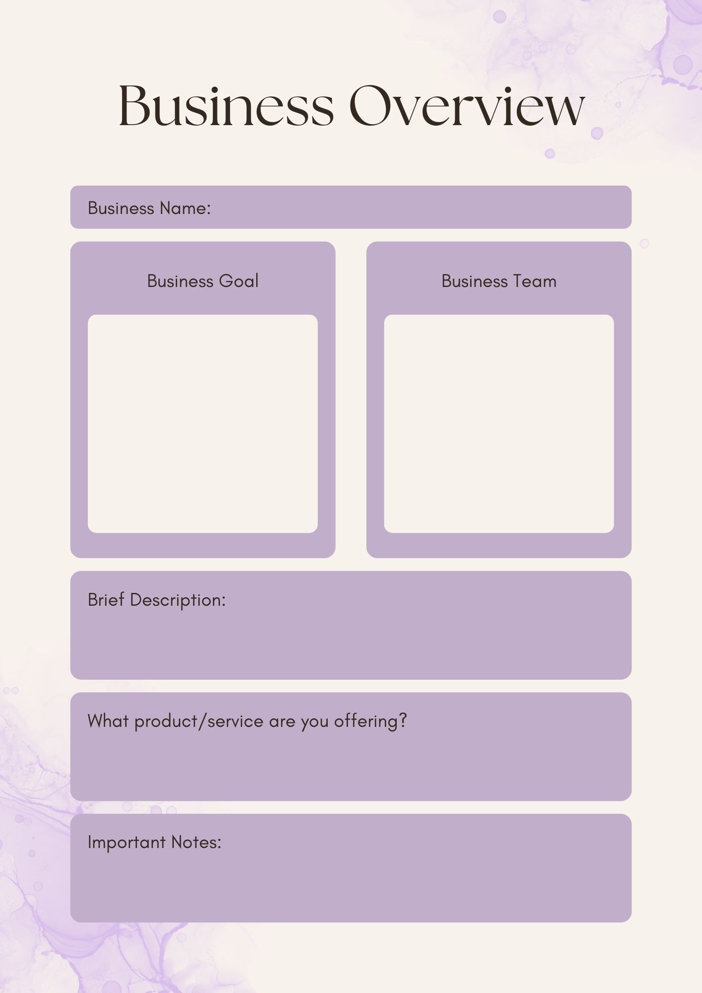 The name of your business, your goals, your team and the products/services you propose to offer. This gives a clean headstart to further evolve your business plan.