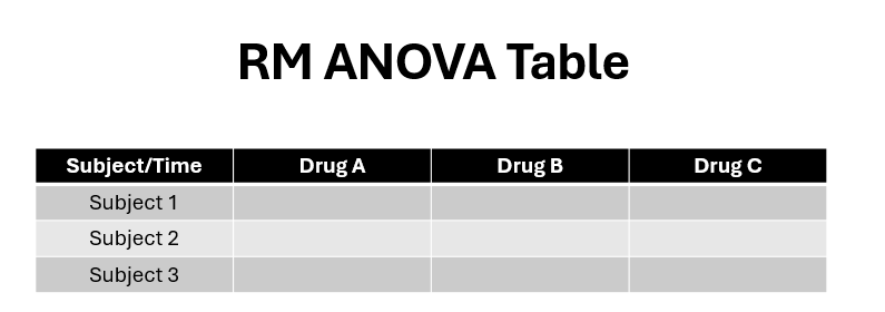This is a One-Way RM ANOVA Design. Familiar right? But wait. Remember when we talked about RM Designs, one of the major problems was about order effects. What if actually, drug A is the super effective one — and after drug A my happiness levels are just perpetually sky high? If this is the case and I take drug A first — then drugs B & C will naturally seem to have no effect on me — even though they might actually also be equally effective!