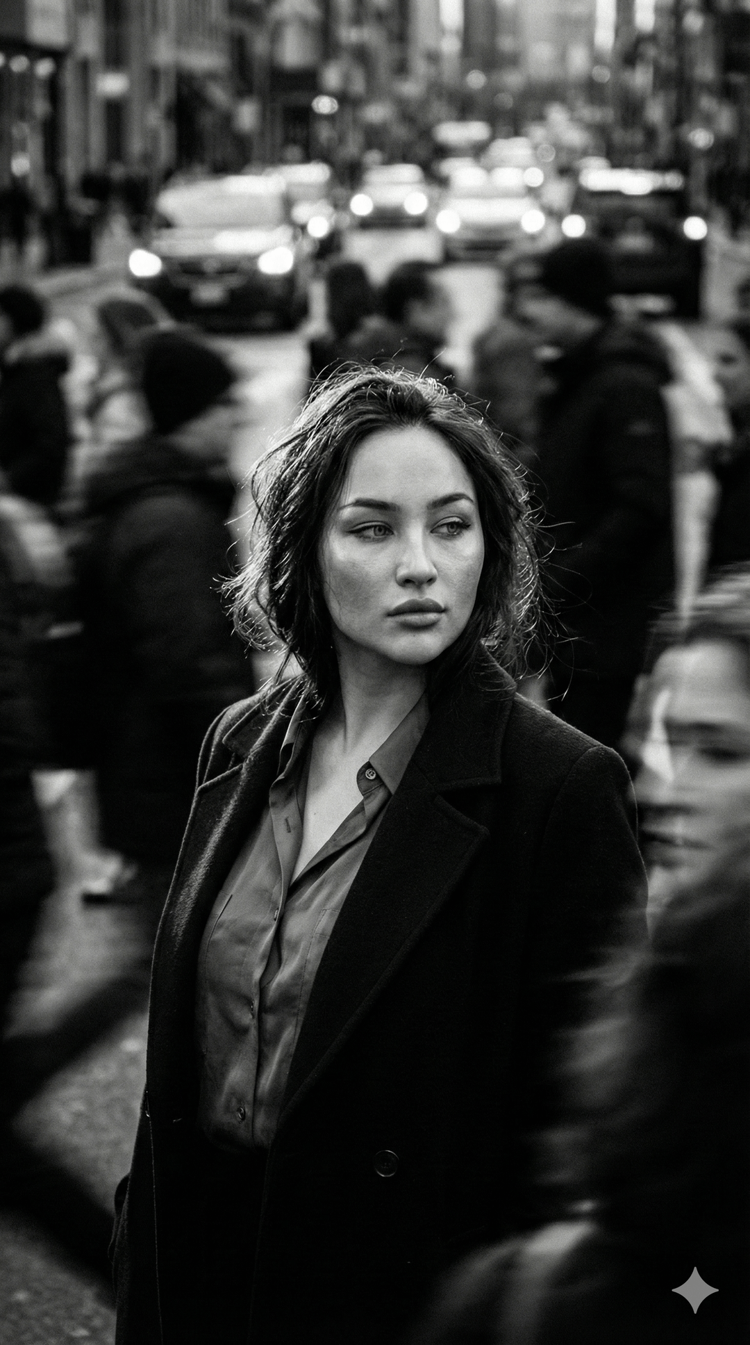A 9:16 monochrome cinematic portrait set in a busy urban environment, using my uploaded images for full facial accuracy, matching bone structure, expression, hairstyle, and overall likeness. The subject stands still in the center of a fast-moving crowd, creating a striking contrast between calm focus and surrounding blur. The background is filled with motion streaks from people walking past and distant lights, producing a dynamic yet moody atmosphere.