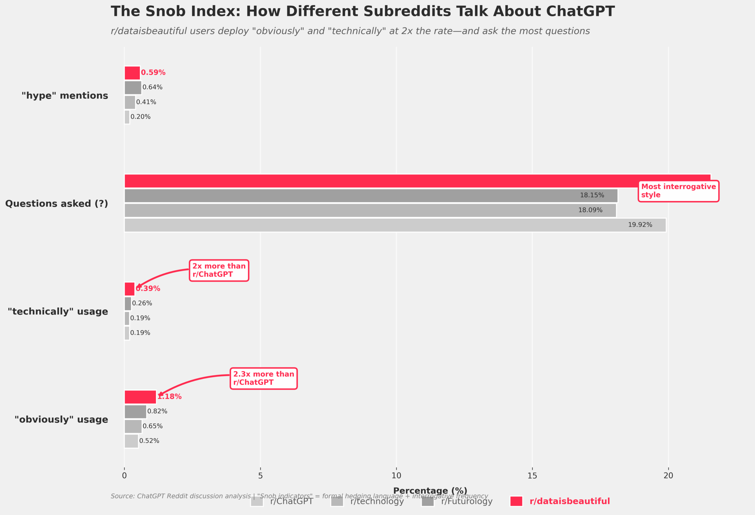 * r/dataisbeautiful is 2.3x snobbier (by "obviously" usage)