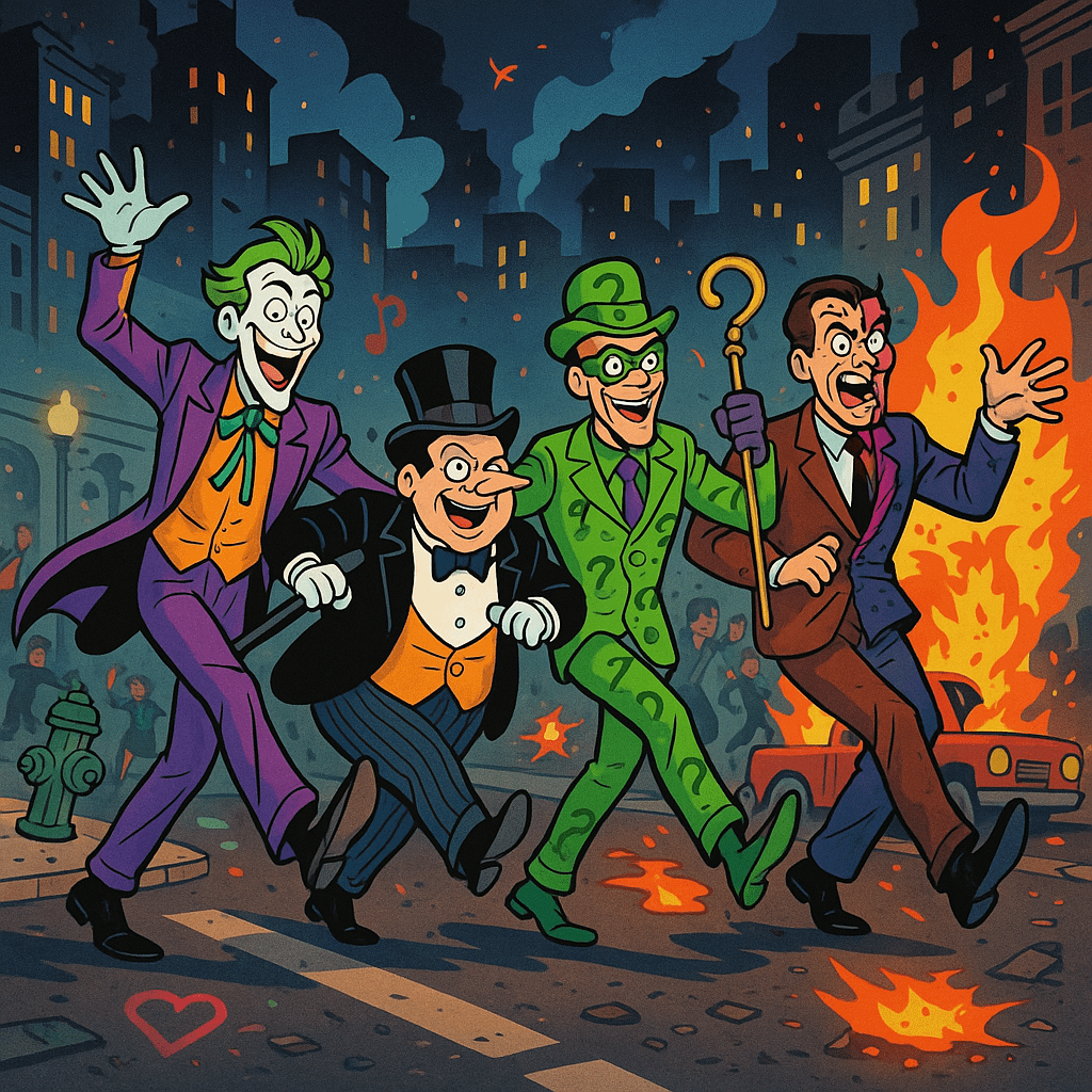 The villains bow with dramatic flair as Gotham burns behind them — spotlights swirling, civilians screaming, and jazz horns blaring triumphantly.