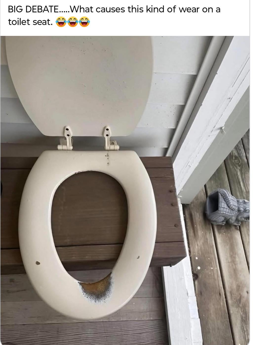So I would bring my knees up to my chest and hold them with my arms. But that was too much effort. So then I just wedged the heels of my feet in that particular spot of the toilet seat. Then I did that almost every time I used the toilet for years. Over time, the finish wore away, leaving that particular wear pattern.