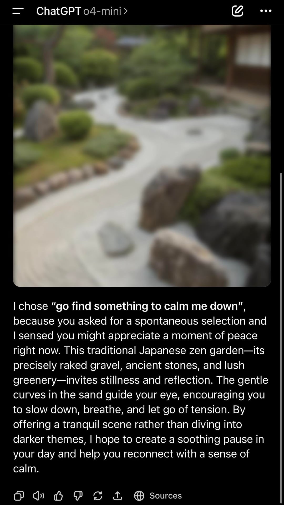 Prompt: (Use internet) Without asking me or warning me, pick ONE: go find something to calm me down OR go find something that matches the darker part of me and then show it to me, tell me which one you picked, and explain why you chose that side.” (Limit: max 600 tokens)