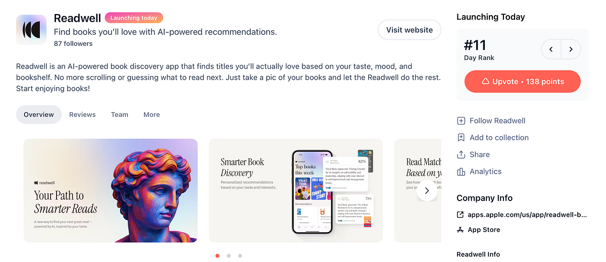Yesterday morning, I found Readwell climbing Product Hunt with 138 upvotes and a “Launching today” badge. The concept was solid: AI-powered book recommendations based on your taste, mood, and bookshelf photos.
