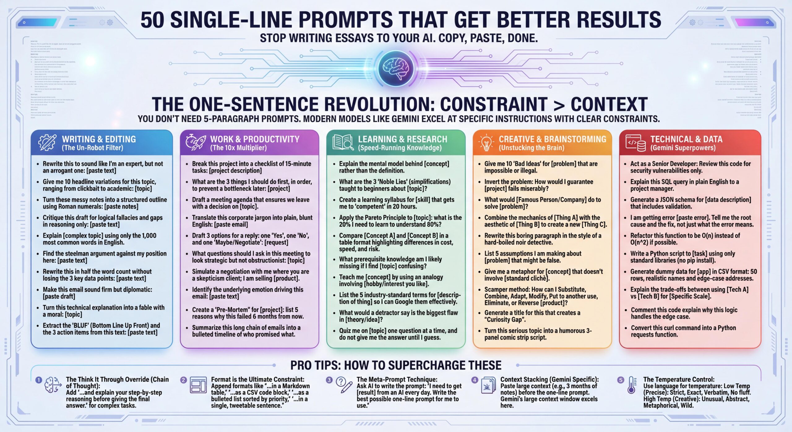 3. The Meta-Prompt Technique If you have a recurring task but don't know how to prompt for it, ask Gemini to write the prompt for you: "I need to get [result] from an AI every day. Write the best possible one-line prompt for me to use."