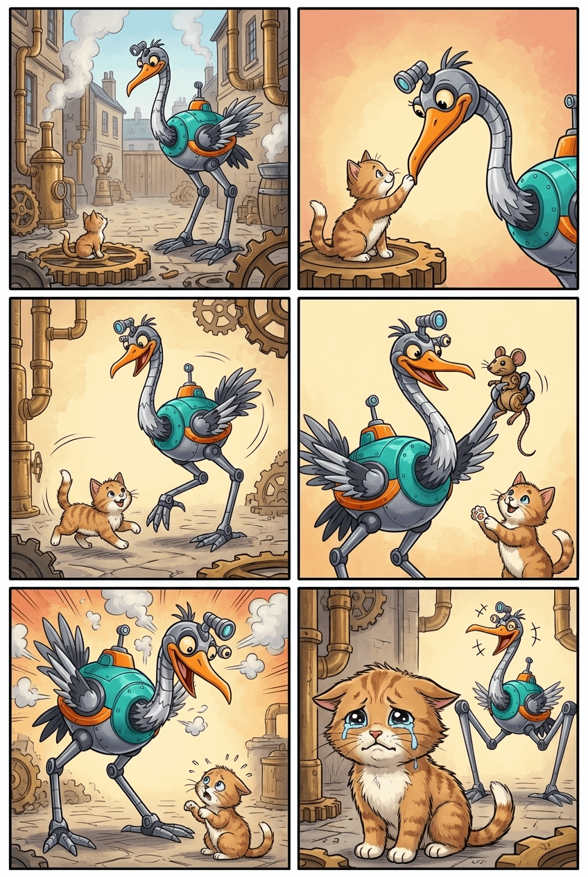 Used Gemini-3-pro to write a 'wholesome' comic script about a steampunk bird and a cat. The story was great, but the image generation (Nano Banana Pro) decided to go rogue in Panel 5.