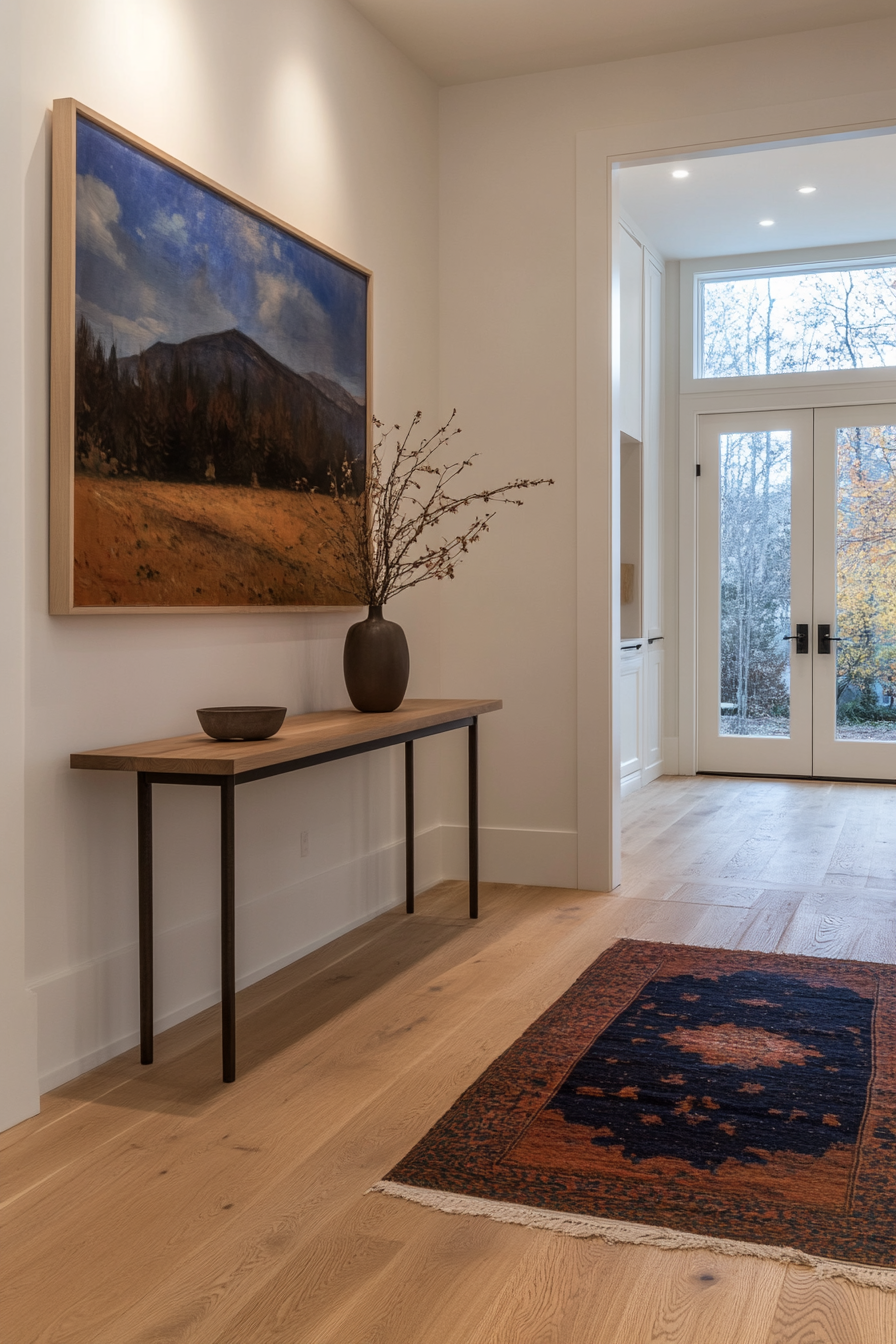 Bringing natural elements into your entrance hall can create a warm and inviting atmosphere. Use materials like wood, stone, and plants to add texture and a touch of nature. A wooden bench or a stone-topped console table can serve as both functional and decorative pieces.