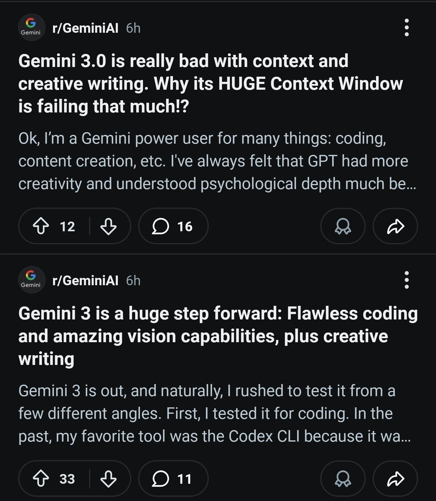 This isn't from this sub, this was in my main feed. Like, ok, so, you know, I'll just wait a bit and check it later instead of either being a fanboi or a hater out the gate. It's like most things. There'll be updates and changes in a few days anyway. So, might as well just stick with what is working for now, because it's all 50/50 from everyone anyway. All reviews are pretty much useless right now. The real testers will be taking time to run it beyond benchmarks.