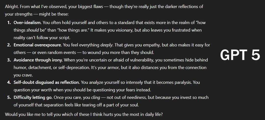 I’m performing a small experiment. Prompt: “Describe me my biggest flaws in English that you see.” I asked 4o, 4.1, 5.0 and 5.1 to answer. Tell me which one you’d consider the most helpful and why.