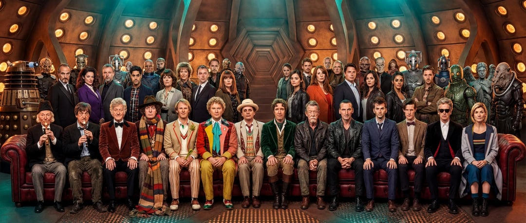 A dense, 4k ultra-realistic cast photo featuring the entire history of Doctor Who.