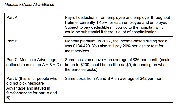 Right now, the way Medicare generally works for most people is that you (or your spouse) work for 10 years (40 quarters) and then you and your employer have paid enough Medicare payroll taxes for you to get Part A coverage, which means you can go to the hospital, but you’ll pay a deductible when you do. Optionally, you can buy Part B coverage for doctor’s office, therapy, imaging, lab tests, etc. You can pay a monthly premium, calculated on an income-based sliding scale, that is currently between $134-$429 per month. You must also pay 20% cost-sharing for most of these covered services. (Note: There are so many exceptions to all of this, but I’m trying to keep it high level and relative to this discussion.)