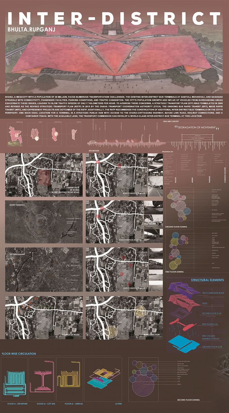 DHAKA,A MEGACITY WITHA POPULATION OF 20MILLION,FACES NUMEROUS TRANSPORTATION CHALLENGES.THE EXISTING INTER-DISTRICT BUS TERMINALS AT GABTOLI,MOHAKHALI,AND SAIDABAD STRUGGLE WITHCONNECTIVITY,PASSENGER FACILITIES,PARKINGCONDITIONS,ANDTRAFFIC CONGESTION.THE CITY’S POPULATION GROWTH AND INFLUX OF VEHICLES FROM SURROUNDING AREAS EXACERBATE THESE ISSUES,LEADING TO SLOW TRAFFIC SPEEDS OF ONLY 7 KILOMETERS PER HOUR.TO ADDRESS THESE CONCERNS,A STRATEGIC TRANSPORT PLAN(STP) WAS FORMULATED IN 2005 AND REVISED AS THEREVISED STRATEGIC TRANSPORTPLAN(RSTP) IN 2015 BY THE DHAKA TRANSPORT COORDINATION AUTHORITY(DTCA).THE ON GOING BUS RAPID TRANSIT(BRT),MASS RAPID TRANSIT(MRT),AND EXPRESS WAY PROJECTS ARE OUTCOMES OF THE RSTP.ADDITIONALLY,THE RSTP RECOMMENDS THE CONSTRUCTION OF ADDITIONAL INTER-DISTRICT BUST ERMINALS ON THE CITY’S PERIPHERY.ONE SUCHIDE ALLOCATION FOR A TERMINAL IS A STRATEGIC PUBLIC HUB WITH ACCESS TO THE DHAKA-CHITTAGONG HIGHWAY,BAYZID LINK ROAD,RAILWAY CONNECTIONS,AND A CONTAINER TRACK.WITH THE AVAILABLE LAND,THE TRANSPORT COMMISSION CAN DEVELOP A WORLD-CLASSINTER-DISTRICT BUS TERMINAL AT THIS LOCATION.