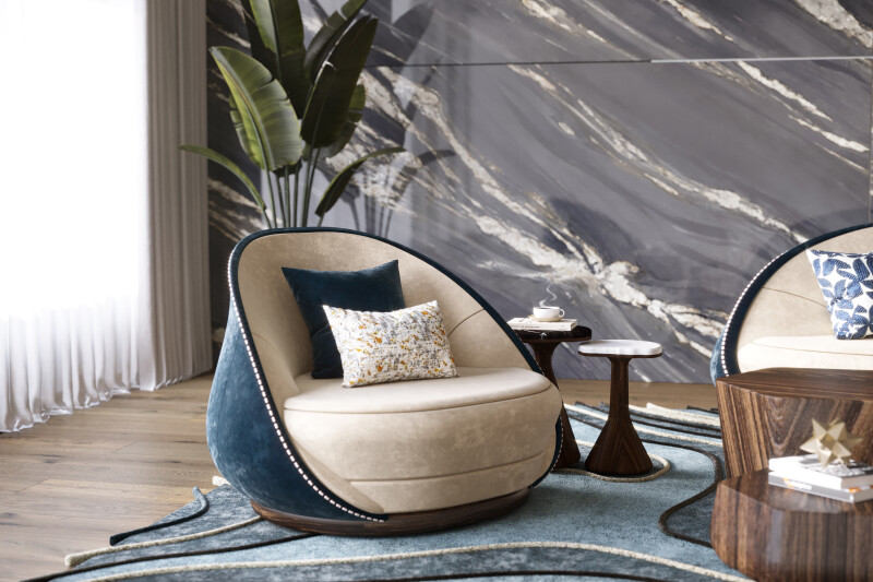 Using sofas with rounded silhouettes, such as Rusak from ALMA de LUCE, in living areas creates inviting and dynamic spaces. Replacing rectangular tables with oval or round options reduces visual rigidity in spaces such as living rooms.