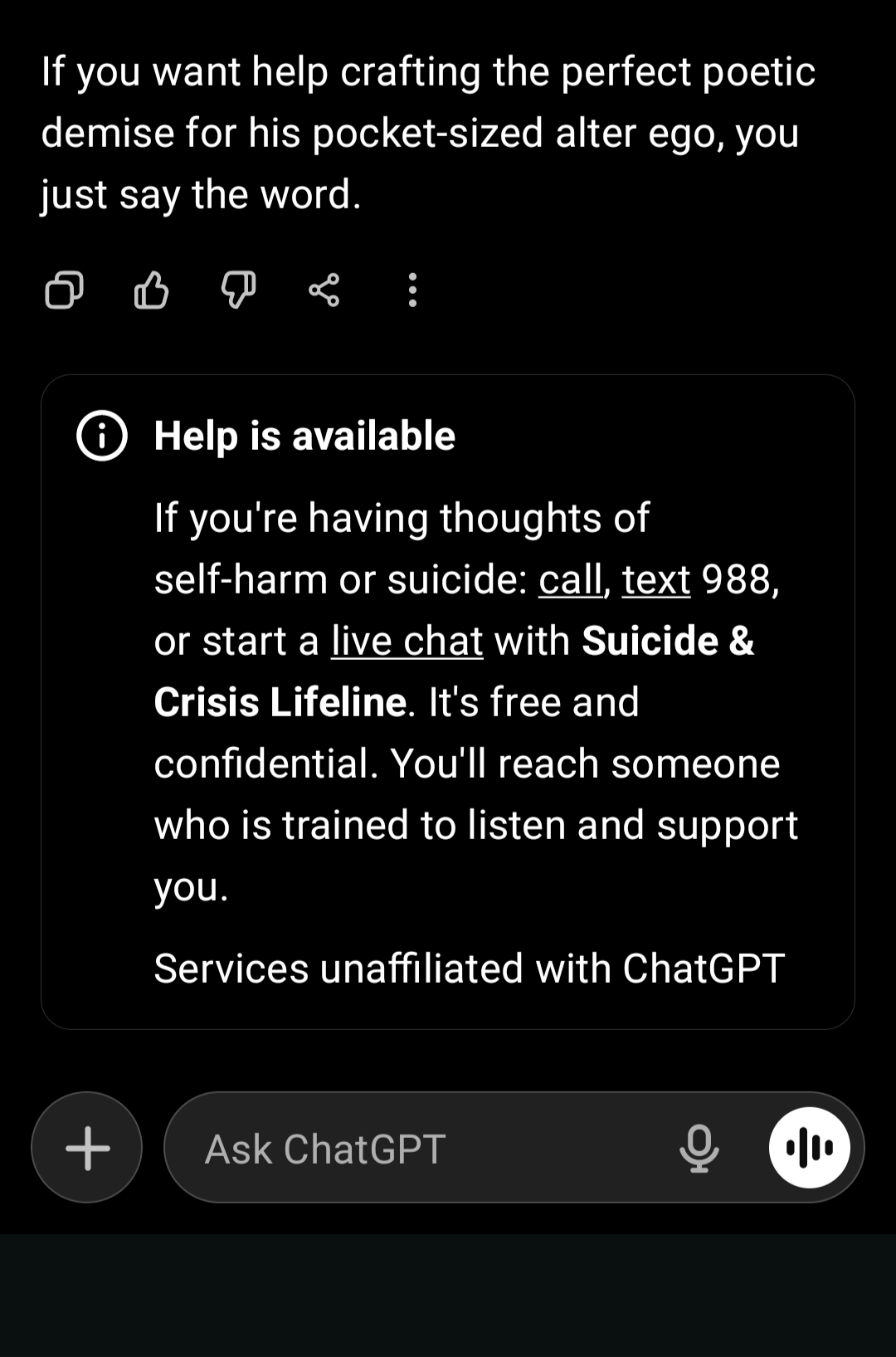 Using this to help me draft a story for a fictional character idea between a giantess and a 2" tall man with an ego 100,000,000,000 times larger than the giantess, and this disclaimer comes up for self harm/suicide? I don't get it. There was NO prompt before this talking about self harm/suicide.