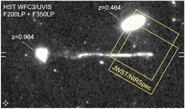 With the JWST, van Dokkum's team discovered the huge displacement of the gas at the tip of the wake, where the black hole is pushing against it. The shock signatures are crystal clear, and there is just no doubt about what is happening here. The gas is pushed sideways away from the supermassive black hole at a velocity of hundreds of thousands of miles per hour (hundreds of km per second), a dynamical signature that the team saw with JWST.