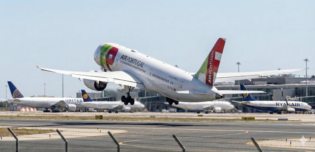 Prompt #1 : Generate an image of a TAP Air Portugal Boeing 787-9 (stretched version) taking off from the runway (pitching upward) with its flaps down for takeoff configuration, gear still down, include ground markings, background aircraft (realistic liveries, United 777-200, Lufthansa A320-200, Air France A320-200, Ryanair 737-800), weather is sunny/bright no clouds, highly detailed, include heat distortion from engines, lens motion blur, cinematic shot taken from a couple feet away outside airport perimeter, taken by a professional DLSR camera.
