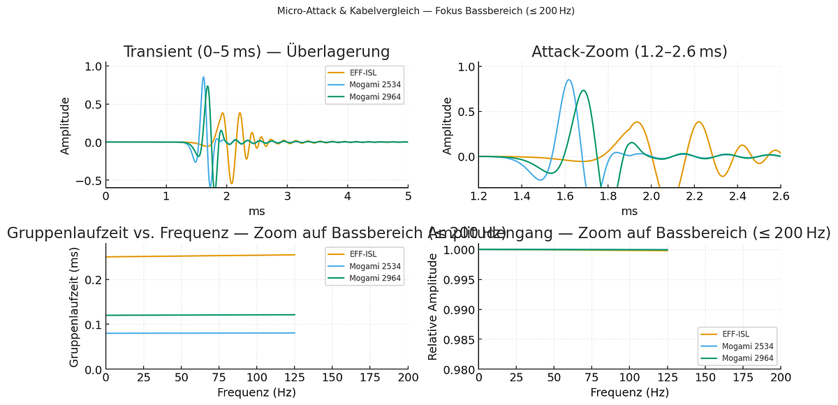 So what does that mean now? Depending on your setup, you need to know this and how to work with it. But it means in essence that the attack peak is about 0.1-0.3ms delayed with the EFF ISL Supra cables, and at the same time the distribution of energy is more even, but the damping factor is lower as well coming with this. This results in less dynamics, but possibly in a more textured bass representation. There is no wrong or right here. But it is a bit easier to handle in my experience, if you have a ‘flatter but wider microattack energy spike’: room modes are less exited.