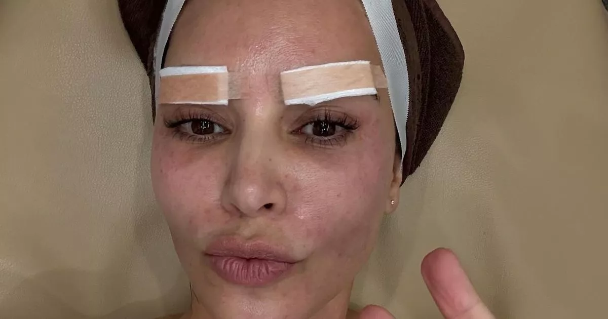 Other photos showed Kim with tape and Band-Aids over her eyebrows, suggesting she may have been getting them dyed. Two more images featured her with a white substance on her face, likely from a specialty facial.
