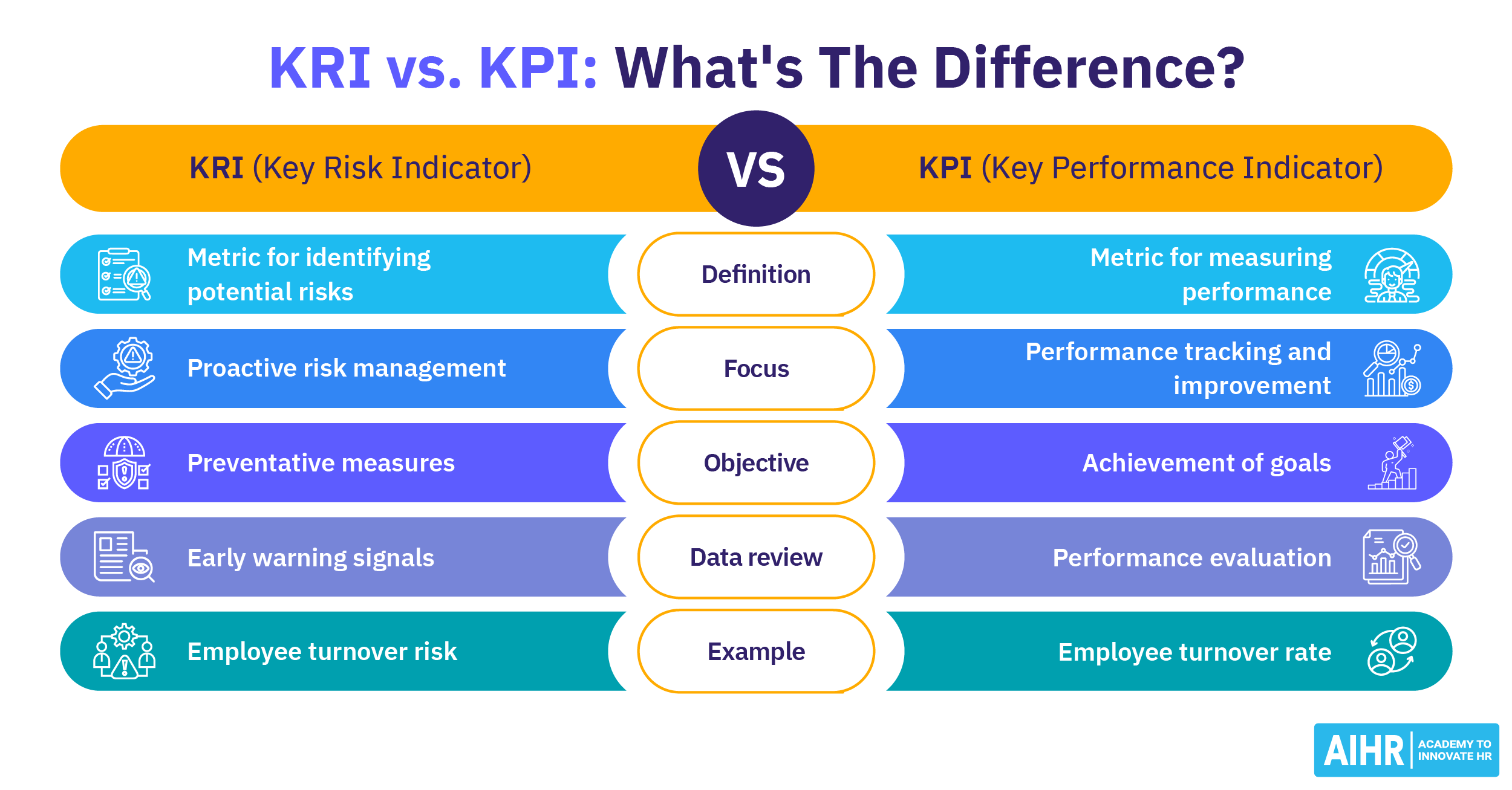 For example, when considering the cost implications of employee turnover, SHRM found that hiring a new employee can cost three to four times the position’s salary. This makes it crucial to monitor both turnover risk (a KRI) and turnover rate (a KPI).