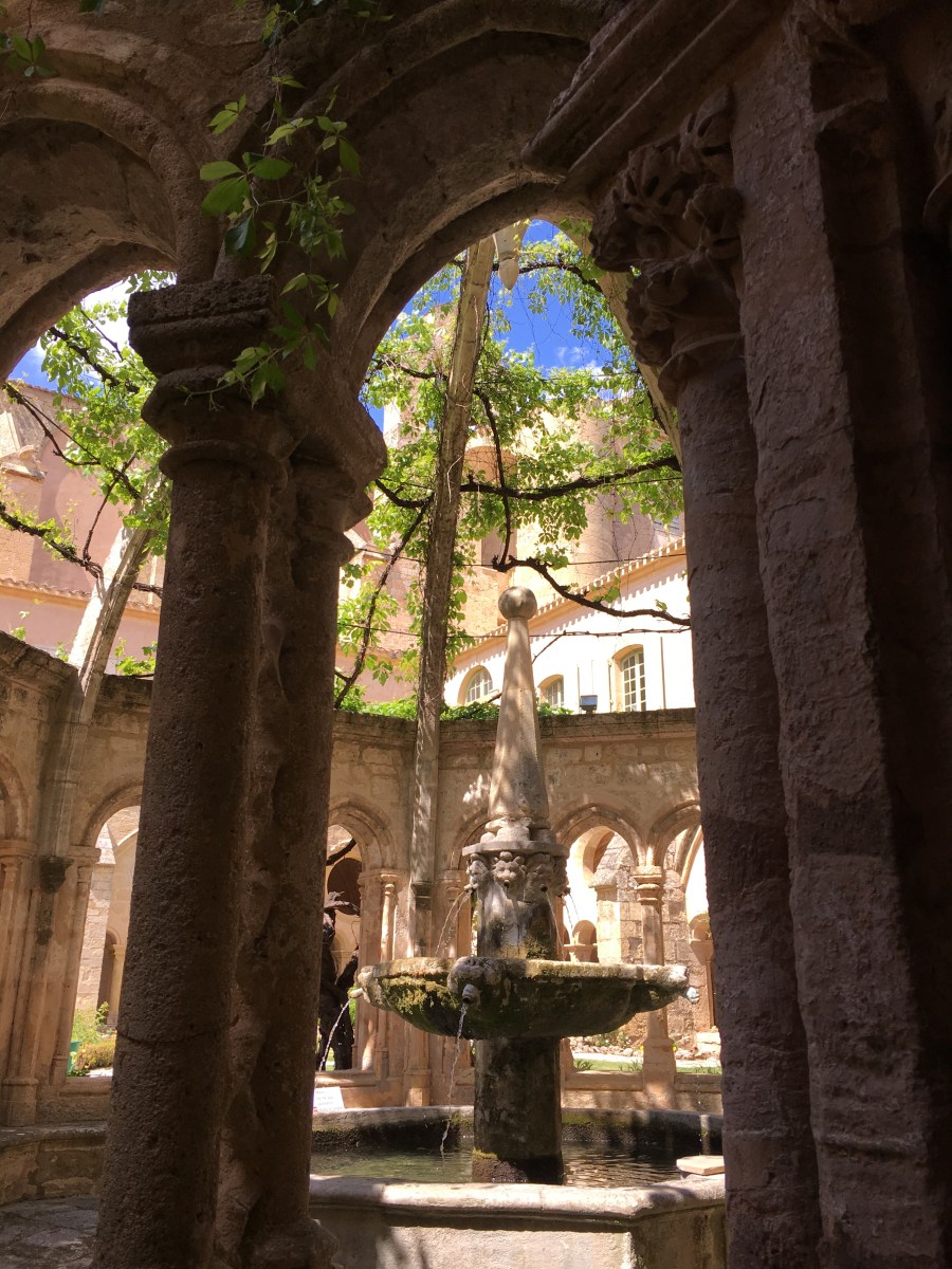 My favorite part of the Abbey, though, is not the church and its winemaking operation, but the attached cloister and surrounding gardens. The cloister is beautiful and the lavabo with its gentle fountain, where the monks washed their hands and faces before prayer and meals, is a truly serene spot.