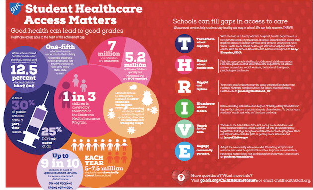 Elevating this conversation and raising awareness among stakeholders — including educators, parents, school health experts, public health professionals and child advocates — is an important step towards making decisions, plans and changes that will best serve your community. Start here: http://www.aft.org/childrens-health-safety-and-well-being/childrens-access-care and stay tuned for more AFT conversations on school-based Medicaid and improving children’s access to healthcare.