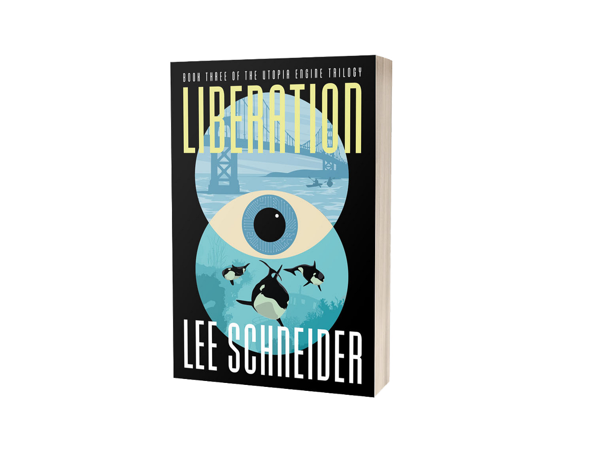 The cover of the novel LIBERATION has a black background with LIBERATION in green letters. At the center is a blue eye, and there are two overlapping circles, the top one showing the Golden Gate Bridge, and the bottom showing a pod of orcas.