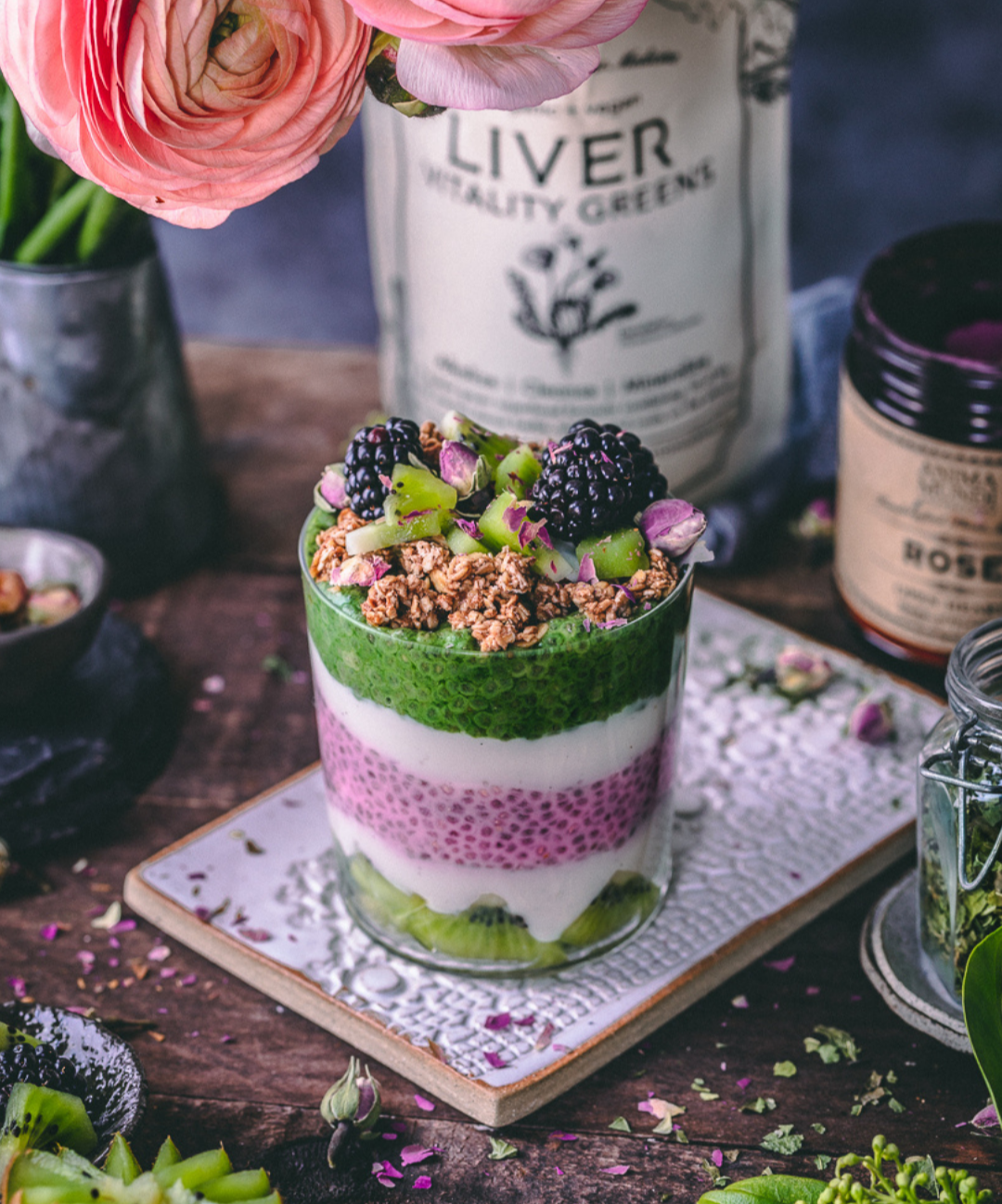 Our Liver Vitality powder is a nutritionally dense, therapeutic green cleanse with the power to detoxify your liver and gallbladder. This highly cleansing mix can jumpstart your overall digestion! It contains a mega-load of anti-cancerous chemicals known for their ability to help eliminate heavy metals, environmental toxicity accumulation, and stressors inhibiting overall organ function. By adding it to this absolutely delicious chia pudding along with fruits, granola, and coconut milk, we are providing a delicious way to detoxify the body, and nourish the soul.