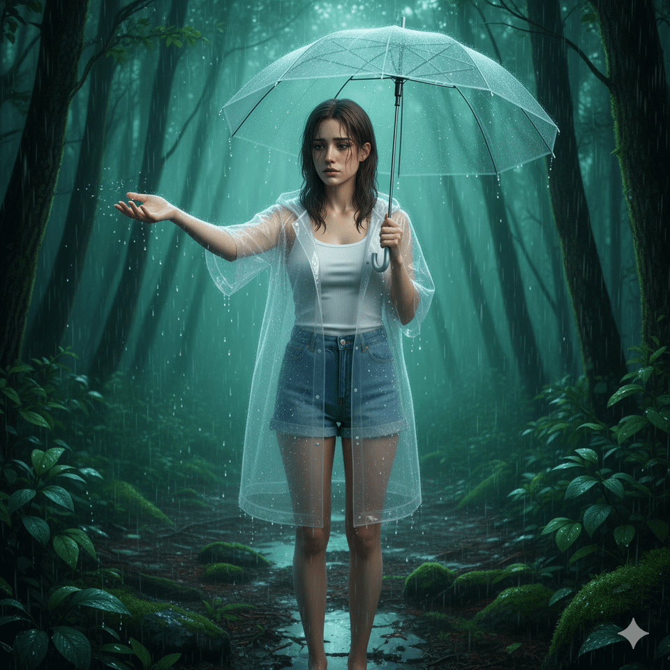 The character stands alone in a dense, emerald green forest under heavy rain, wearing the transparent rain poncho and holding the umbrella. The camera angle is from slightly above, as if capturing the character reaching out a hand to feel the raindrops. The tank top and denim. shorts are visible beneath the poncho. Puddles on the forest floor, wet moss, droplets sliding down large leaves, and mist drifting between the trees. The scene conveys smallness and quiet solitude within the vast, rain-soaked nature.