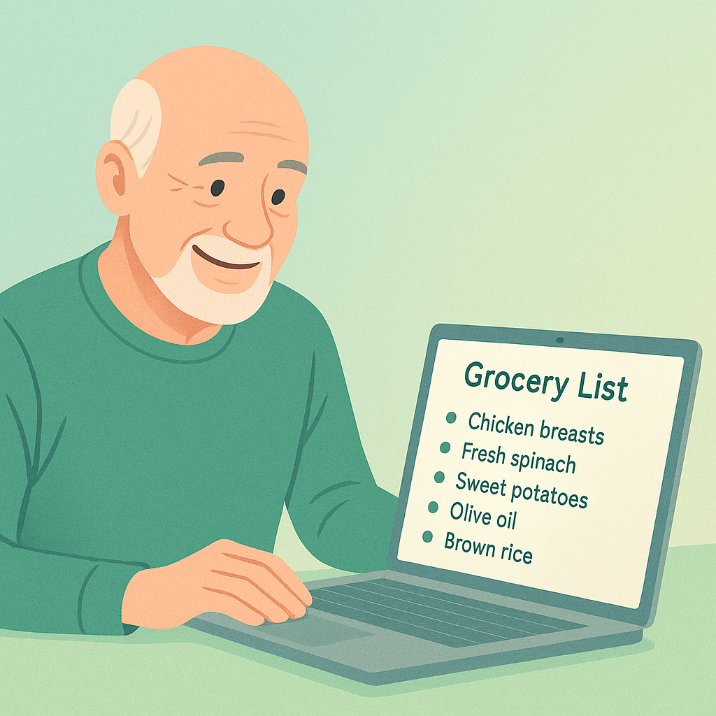 Smiling older adult using ChatGPT to make a grocery list on a laptop — calm lighting, green-blue tones. By TandA.