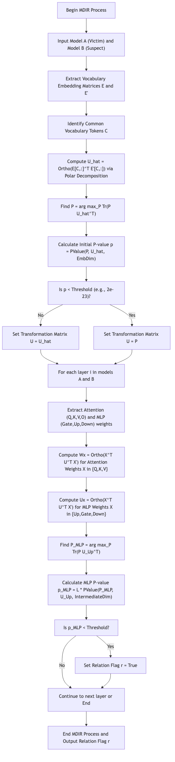 The paper tackles the growing concern of intellectual property (IP) infringement in Large Language Models (LLMs), where models might plagiarize others by direct weight copying, upcycling, pruning, or continual pretraining without proper attribution. Current detection methods often fall short; they struggle to reconstruct specific weight correspondences, lack rigorous statistical measures like p-values, and can mistakenly flag models trained on similar data as related.
