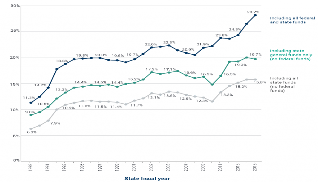 Figure One: Medicaid’s Share of State Budgets Including and Excluding Federal Funds, SFYs 1989–2015