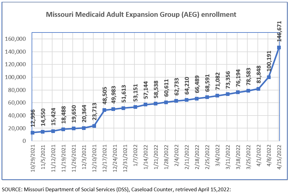 The recent growth in enrollment in the Medicaid expansion population in the last two weeks (64,823 enrolled in the AEG group through the two weeks ending April 15,) represented mostly a set of individuals being transferred from one enrollment category to another, and thus, will not affect the overall enrollment in Medicaid. Reports from the state indicate that the recent growth in enrollment is due to converting some individuals currently categorized as pregnant women, adults on Medicaid for families, children aging into adulthood, and those in the Show Me Healthy Babies program. According to an analysis of the official data released by the State of Missouri (see Figure 1,) Medicaid expansion enrollment has been growing by about 2,000–3,000 enrollees per week.