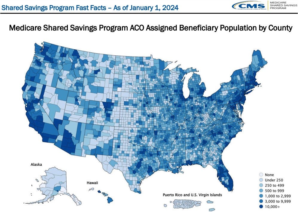 Figure 1: CMS 2024 Shared Savings Program Fast Facts. MSSP assigned beneficiary population by county (credit CMS.gov)