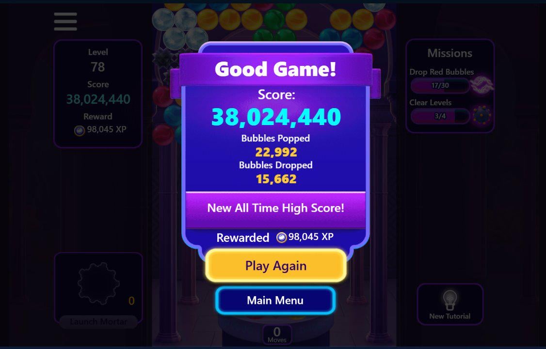 I just got to level 78 with 38M points in Microsoft Bubble (it's in Solitaire and Casual Games on Windows 11), without watching any ads for extra moves. This beat my previous record of 14M.
