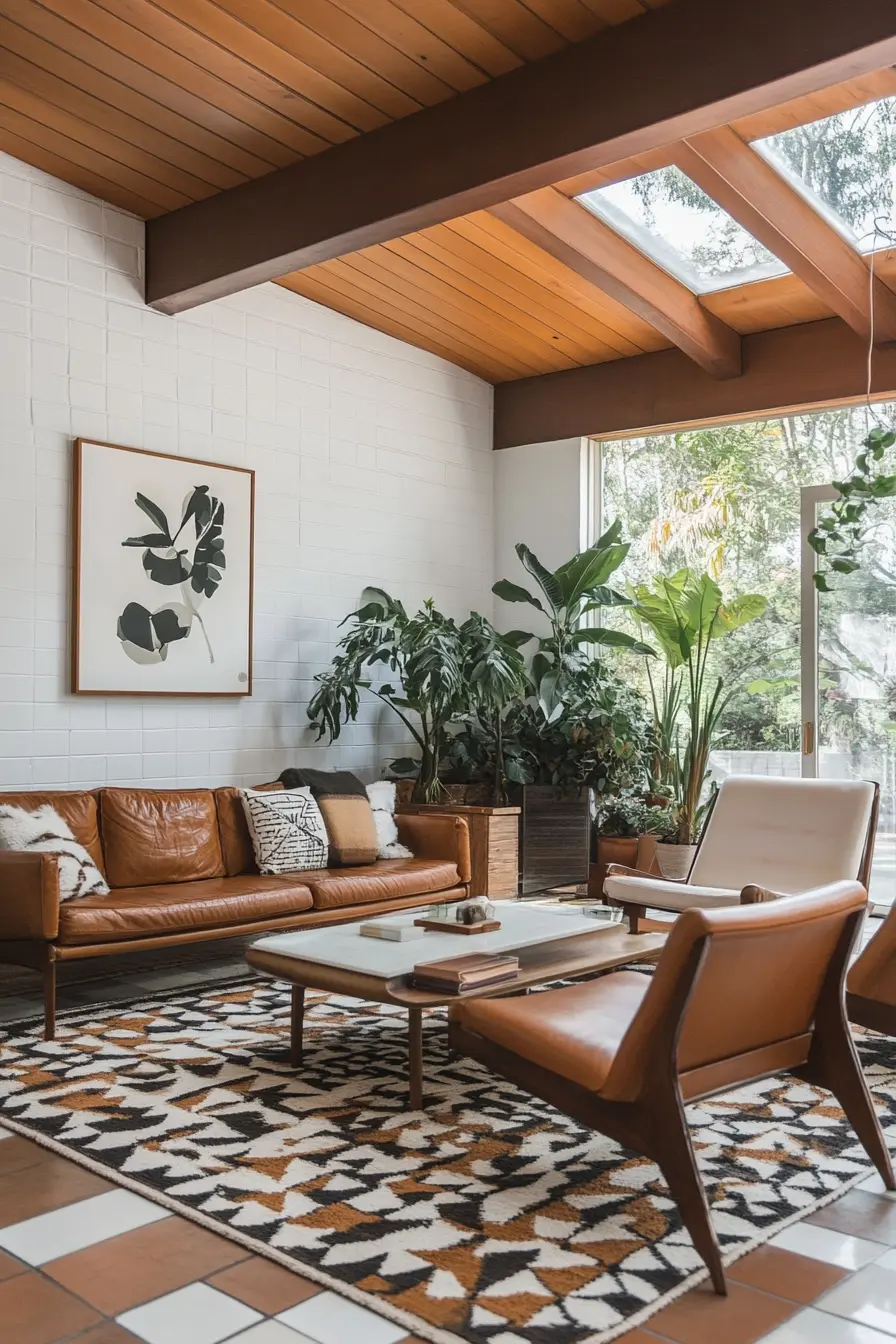 Decor elements like abstract art, geometric rugs, potted plants, and mirrors with minimalistic frames help complete the mid-century modern look.