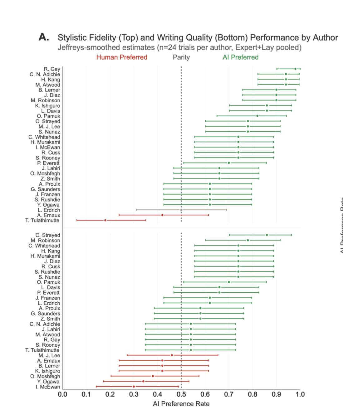 However, fine-tuning ChatGPT on individual author’s complete works completely reversed these findings: experts now favored AI-generated text for stylistic fidelity and writing quality, with lay readers showing similar shifts. These effects are robust under cluster-robust inference and generalize across authors and styles in author-level heterogeneity analyses.