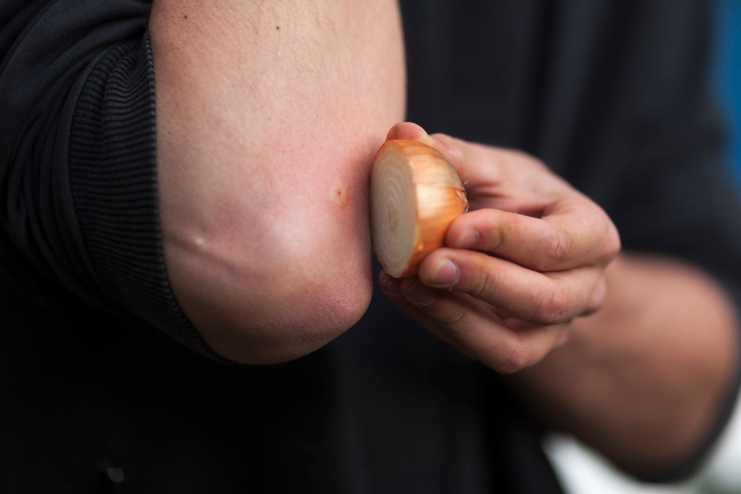 Zwiebel: Eine frisch aufgeschnittene Zwiebel auf den Stich legen. Der Schwefel im Zwiebelsaft wirkt antibakteriell, desinfiziert, lindert den Juckreiz nach Insektenstichen und kann Schwellungen mindern.