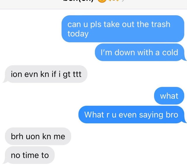 Idk I’ve given up with talking to him over text atp. He doesn’t pick up calls so that isn’t an option lmaooo. We’re both gen z so I understand most his slangs like “ts” or “sch” or “fr” but I feel like the rest of it he just made up and he won’t stop with this act and it’s seriously going to put me into a coma anytime soon.