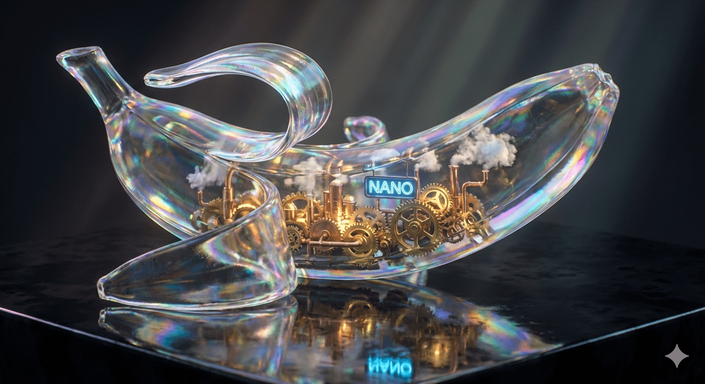 A hyper-realistic macro close-up of a peeling banana made entirely of translucent iridescent crystal. Inside the banana, instead of fruit, there is a miniature, highly detailed steampunk city with moving gold gears and tiny steam clouds. A small neon sign floating in the center of the city explicitly reads 'NANO'. The object is resting on a wet obsidian surface reflecting the scene. Cinematic volumetric lighting, subsurface scattering, 8k resolution, ray tracing, sharp focus