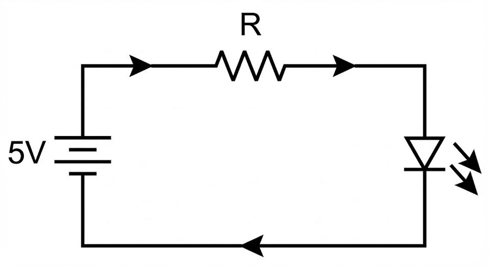 prompt for basic LED: generate an image of A minimal electronic schematic diagram, showing a single LED connected in series with a resistor to a 5-volt battery source. Clean lines, simple symbols, no background clutter, black-and-white technical drawing style.