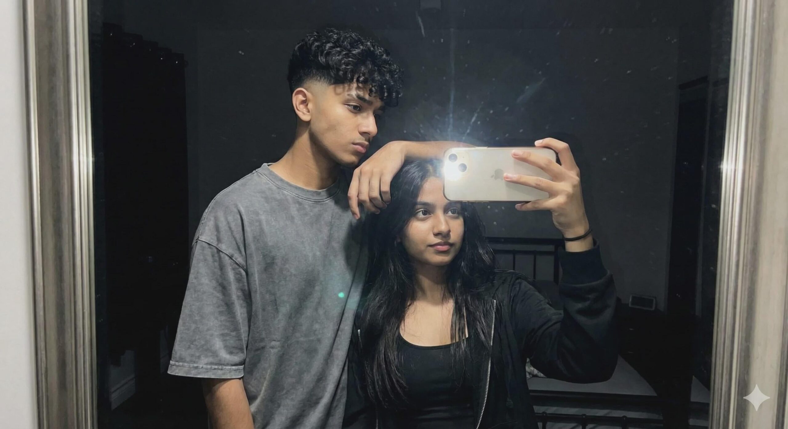 A completely dark bedroom with no visible ambient light. The only illumination comes from the iPhone camera flash, creating a harsh, bright foreground and a nearly black background. This is a mirror selfie taken by two Indian teenagers.