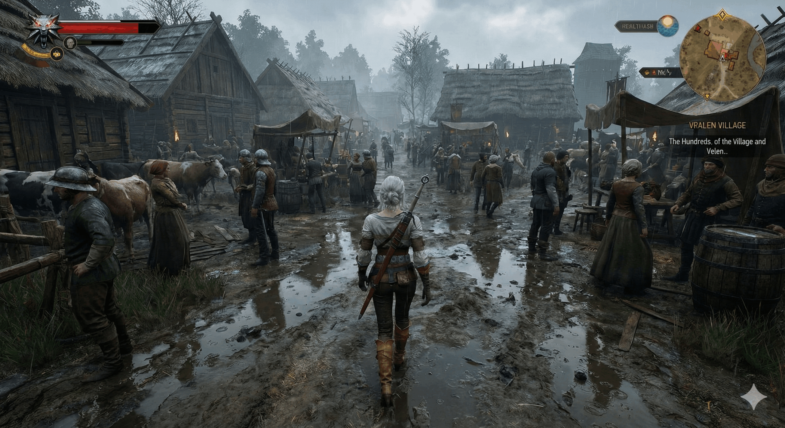 "Generate an image of Ciri visiting a crowded village in Velen. Witcher 4 style with full next gen graphics, ray tracing and all the details that we are expecting from unreal engine 5. Make it look as if we are playing the game."